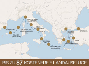 | über Kavala/Philippi, Izmir, Athens (Piraeus), Mykonos, Messina (Sizilien), Naples, Rom (Civitavecchia), Livorno, Mahon (Menorca) |
