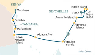 | über La Digue, Praslin, Amirante Island, Alphonse Island, Farquhar island, Aldabra Atoll, Kilwa Kisiwani Island, Mafia Island, Sansibar |
