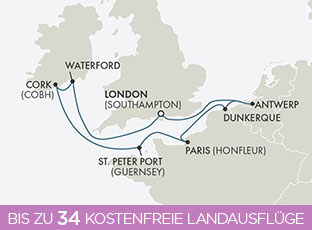 | über Dünkirchen, Paris (Honfleur), St. Peter Port (Guernsey), Cork (Cobh), Waterford |