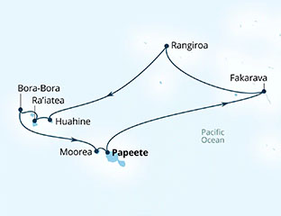 | über Tuamotu, Rangiroa, Huahine, Raiatea, Bora Bora, Moorea |