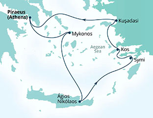 | über Mykonos, Agios Nikolaos, Symi, Kos, Kusadasi (Ephesus) |
