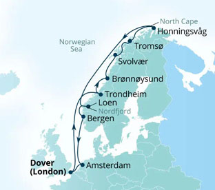 | über Trondheim, Brønnøysund, Svolvaer (Lofoten), Tromsø, Honningsvåg, Loen (Olden), Bergen, Amsterdam |