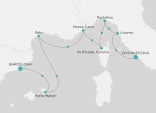 | über Livorno, Portofino, Ile Rousse, Monte Carlo, Sete, Porto Mahon |