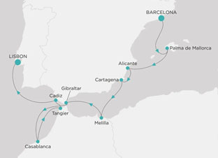 | über Palma de Mallorca, Alicante, Cartagena (Murcia), Melilla, Gibraltar, Casablanca, Tangier, Cadiz |
