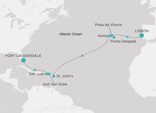 | über Praia da Vitoria, Ponta Delgada (Sao Miguel Island), Horta, St. John`s, Jost Van Dyke (British Virgin Islands), San Juan |