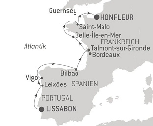 | über Leixões, Vigo, Bilbao, Bordeaux, Talmont-sur-Gironde, Belle-Île-en-Mer, Saint-Malo, Guernsey |