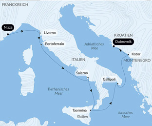 | über Livorno, Portoferraio, Salerno, Taormina, Gallipoli, Kotor |