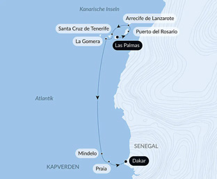 | über Puerto del Rosario, Arrecife de Lanzarote, Santa Cruz de Tenerife, San Sebastian de la Gomera, Mindelo, Praia, Dakar |