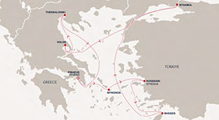 | über Mykonos, Kusadasi (Ephesos), Rhodos, Istanbul, Volos & Thessaloniki |