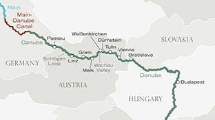 | über Bratislava, Tulln, Wachau, Dürnstein, Weißenkirchen, Linz, Passau, Grein, Melk |